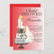 Beginnen Sie Ihr elegantes Brautparty mit unserer angesagten Brautdusche aus Blonde mit einer klassischen Blonde Braut, die auf einem stilvollen, dreistöckigen, dreistöckigen Hochzeitskuchen-Set auf einem rot verblassten Hintergrund sitzt. Anpassen Sie einfach unsere Einladung mit Ihren Polterabend-Informationen und Sie sind alle Set zu gehen. ©JW Illustrationen