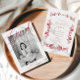 Celebrate your graduate with this modern and elegant graduation photo announcement card. Featuring a bold red script overlay on a black and white photo, paired with a delicate vintage floral frame, this design creates a striking editorial-style look.