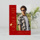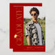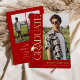 Celebrate your graduate in timeless, elegant style with this modern real gold foil graduation invitation. Set against a trendy red background, the design features trendy serif “GRADUATE” typography running vertically down the side, creating a refined focal point. A stylish graduation cap icon sits above the “R,” while the flowing tail of the letter transforms into a sleek tassel—leading the eye to a standout photo of the graduate.