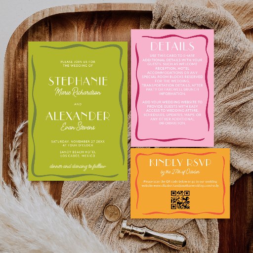 Set against a lively citrus green background, this design instantly radiates energy and warmth—perfect for destination weddings, outdoor celebrations, and couples who want their stationery to stand out from traditional neutrals. The vibrant green hue evokes sun-soaked destinations, lush landscapes, and modern confidence, making it especially fitting for beach weddings, tropical venues, garden ceremonies, and modern destination celebrations.