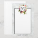 Monogramm Schreibpapier mit hübscher Aquarellfarbe. Eine Blumenstruktur mit vielen verschiedenen Blume in Rot-, Rosa- und Weißtönen und viel grünem Blattwerk. Ein überlagerter Rahmen mit einem Imitat-vergoldeten Rahmen. Elegantes Design. Hintergrund aus weißem Marmor. Ein weißes Rechteck mit einem schwarzen Rand, damit Sie drinnen schreiben können. Ihr personalisierter Name unten.