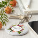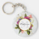 Ein personalisierter Schlüsselanhänger mit hübscher Aquarellgestaltung. Eine Blumenstruktur mit vielen verschiedenen Blume in Rot-, Rosa- und Weißtönen und viel grünem Blattwerk. Ein überlagerter Rahmen mit einem Imitat-vergoldeten Rahmen. Elegantes Design. Hintergrund aus weißem Marmor. Personalisieren Sie Ihre Daten mit einem Namen und einem Monogramm-Buchstaben.