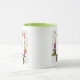 Kaffee Tasse mit hübschem Aquarell-Design. Eine Blumenstruktur mit vielen verschiedenen Blume in Rot-, Rosa- und Weißtönen und viel grünem Blattwerk. Ein überlagerter Rahmen mit einem Imitat-vergoldeten Rahmen. Elegantes Design. Hintergrund aus weißem Marmor. Personalisieren Sie diese mit einem Monogramm-Buchstaben.