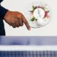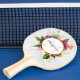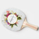 Ping Pong Padle mit hübschem Aquarelldesign. Eine Blumenstruktur mit vielen verschiedenen Blume in Rot-, Rosa- und Weißtönen und viel grünem Blattwerk. Ein überlagerter Rahmen mit einem Imitat-vergoldeten Rahmen. Elegantes Design. Hintergrund aus weißem Marmor.
