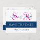 Modern, einfach, Save the Date Wedding Monogram Card Navy Blue und Fuchsia Pink. Design von Elke Clarke©. Vollständig anpassbar speichern Sie die Terminkarten, um Ihre Hochzeitsfeier und das bevorstehende Hochzeitsdatum anzukündigen. Fügen Sie Ihre Informationen und Ihre Monogramm-Initialen hinzu. Sie können sogar den Schriftart und den Abstand des Textes ändern. Eine elegante Art, Ihren besonderen Tag zu verkünden. Save the Date Wedding Monogram Announcement Card