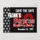 Hier ist eine trendige Save the Date Postkarte in Schwarz-Weiß mit Akzenten von Rot für eine Überraschungsfeier zum 50. Geburtstag. Spaß! Der gesamte Text ist anpassbar.