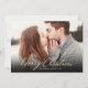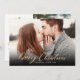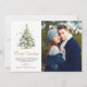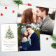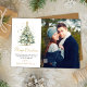 Elegante moderne Script Weihnachtsbaum 2 Foto Weihnachtskarten. Diese festliche, minimalistische Weihnachtskarte aus zwei Fotos zeigt einen Aquarellweih mit Goldbällen und Konfetti, einen "Frohen Weihnachtsgrüßtext", der in einem hübschen handgeschriebenen Kalligraphie-Swash-Schwanz-Schriftart in Gold und Weiß geschrieben ist. Diese Weihnachtskarten des Fotos sind eine tolle Gelegenheit, die Liebsten daran zu erinnern, dass sie sich in dieser Winterferien-Jahreszeit an sie erinnern.
