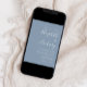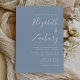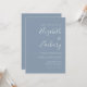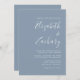 Diese einfache, moderne Hochzeitseinladung mit weißem Text auf einem staubblauen Hintergrund. Fügen Sie die Namen der Braut und Bräutigam in stilvoller Handschrift Kalligraphie und die Details in sans serif Schriftart. Auf der Rückseite ist ein passender Schatten von massivem staubblauem Blau.