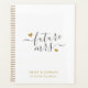 Maßgeschneidertes Hochzeitsplaner-Notizbuch mit "Future Mrs." in moderner, stilvoller Kalligraphie mit goldenen Herzen-Design.