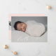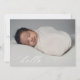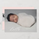Geburtsankündigung mit einem modernen Drehbuch Hallo überlappen das Foto. Die Rückseite erlaubt drei zusätzliche Fotos und eine Nachricht mit bearbeitbarem Hintergrund.