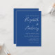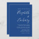 Diese einfache, moderne Hochzeitseinladung mit weißem Text auf indigoblauem Hintergrund. Fügen Sie die Namen der Braut und Bräutigam in stilvoller Handschrift Kalligraphie und die Details in sans serif Schriftart. Die Rückseite ist ein passendes Blau.