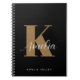 Modernes schwarzes Notizbuch mit dem Monogramm-Initial in einem fett-großen Schriftart und Ihrem Namen in einem stilvollen weißen Kalligraphiesignaturskript.