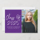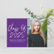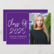 Modern graduation party invites featuring "Class of 2023" in white handwritten script on purple background. Personalize the front of the graduation lädt by adding the graduate name, school name, and vertikale foto. The lade reverses to displayour graduation party details in white lettering on purple background.