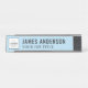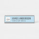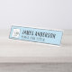 Die moderne und dennoch klassisch schwarz und himmelblau gestaltete Schreibtischtafel enthält ein Firmenlogo und einen Sondertext für den Mitarbeiternamen und den beruflichen Jobtitel in stilvollen Schriftart. Kann vollständig mit Ihrem eigenen Text und Farben personalisiert werden, zusammen mit Ihrer Auswahl an Rahmenfarben.