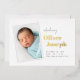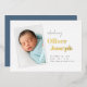 Frische und moderne Geburtsankündigungskarten verfügen über ein vertikales Foto mit einem weißen Schnappschuss-Rahmen, das diagonal neben dem Namen Ihres Babys in Goldfolie platziert ist. Die Geburtsdaten des Kindes und die Unterschrift Ihrer Familie ergänzen das Design. Fügen Sie drei zusätzliche Fotos auf der Rückseite hinzu.