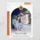 Feiern Sie den Absolventen mit dieser modernen Drehbuch-Abschluss-Einladung mit einem bogenförmigen Foto auf der Vorderseite, ein zweites Foto auf der Rückseite, um über den Grad zu prahlen. Klasse von 20___ auch auf der Vorderseite. Alle Terracotta Akzente Farben können leicht an Ihr Foto oder die Schulfarben angepasst werden.