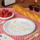 Moderne Grau-Gelb-Teller mit hellgrauen Wolken, Sternen und Mond, die wir über dem Mond haben.