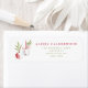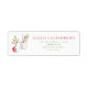 Modern holiday return address labels with a pair of watercolor Christmas tree ornaments illustrations in red decorated with greenery.