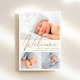 Eine schlichte und elegante helle Creme-Geburtsankündigung mit einer 3-Foto-Collage Ihres Neugeborenen, überlagert mit "Welcome" in einem stilvollen Goldskript. Geben Sie den Namen, das Geburtsdatum und die Geburtsdaten Ihres Babys ein. Auf der Rückseite fügen Sie ein weiteres Foto und Ihre personalisierte Botschaft an Familie und Freunde.
