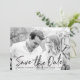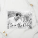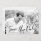 Moderne Save the Date Karte mit dem Foto der horizontalen Verlobung mit "Save the Date" in einem handgeschriebenen schwarzen Script-Overlay. Personalisieren Sie die Vorderseite des Fotos Save the Date mit Ihren Namen, Hochzeitsdatum und Hochzeitsort. Die Karte kehrt zurück, um ein elegantes, weißes und graues Marmordesign anzuzeigen.