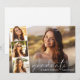 Elegante Abschluss-Ankündigung Flachkarte mit dem Foto des Absolventen überlagert mit einem Streifen von drei kleineren quadratischen Fotos und "graduate" in einem dünnen modernen weißen Skript und ihren Namen und Klasse Jahr in der einfachen weißen Typografie.