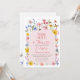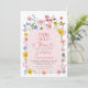 Young, wild and three themed third Birthday invitation for a girl featuring a pink arch, various colored wildflowers, butterflies and bee. This girl young, wild and three is ideal for a girl wildflowers themed third birthday party.