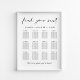 Moderne Hochzeitssitzplakatplakate für bis zu 12 Tische, in denen "Finden Sie Ihren Platz" in einem schicken Skript, Ihre Namen und Hochzeitsdatum durch ein Herz verbunden sind und "Wir sind so froh, dass Sie hier sind" in klassischer Serifentypografie. Sie können die Option zum digitalen Download auswählen, um Änderungen in letzter Minute zu bearbeiten und lokal auszudrucken.