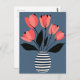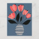 Über einer rosa gestreiften Vase blühen kühne Kobalt-Blütenblätter, die eine spielerische Stimmung aus der Mitte des Jahrhunderts auf einer weichen Korallenbasis wecken.
