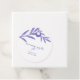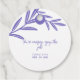 Ein rundes weißes Geschenketikett mit lila Blatt-Design oben. Der Text lautet "Du bist phantastisch, genieße dieses Geschenk" in kursiv, und "Callahan & Ava, 09. Juli 2024" unten in kleinen Kappen. Der Anhänger hat ein Loch oben, um sich an ein Geschenk anzuheften.
