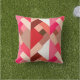 Kopfkissen in einem Mittelalter Modernes Design aus übereinander liegenden Dreiecken in den Farben Korallenrot, Korallenrosa, Taupe-Bräune und Schokoladenbraun, mit weißem Akzent