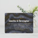 Eine Hochzeitseinladung mit einem wunderschönen Bild von dunklem abstraktem Agrostein. Farben schwingen in Wellen. Die Hauptfarben sind schwarz, blau-grau und ein Imitat-Gold Band, das durch das Design läuft. Modern und trendig.