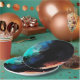 Papier Teller mit einem modernen abstrakten Design. Farbige Spritzer, türkisfarbene, weiße, orangefarbene und schwarze Farbtöne mit blauen Farbtupfern.