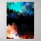 Ein Poster mit einem modernen abstrakten Design. Farbige Spritzer, türkisfarbene, weiße, orangefarbene und schwarze Farbtöne mit blauen Farbtupfern.