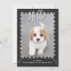 Moderne Welpe Hund Adoption Ankündigung Foto-Karte Ankündigen Sie Ihren neuen Welpen, Hund, Kätzchen oder Pelzbaby im Stil. Mit einem weißen, krautfarbenen Pfotenstreifen und weißen Aquarellherzen Illustrationen. Ganz oben auf der Karte mit einem wunderschönen Script-Schriftart dekoriert, der hallo in weiß sagt. Der Hintergrund ist eine moderne, schwarze Farbe. Personalisieren Sie die Vorderseite der Karte mit dem Bild, dem Namen und dem Familiennamen Ihres neuen Tiers. Auf der Rückseite der Karte können Sie eine spezielle Nachricht schreiben oder bearbeiten, um Gäste zu einem Party für Ihre neue Ausgabe in der Familie einzuladen.