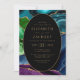 Ein kühner Aquarellrahmen in aquamarinen Blau-, Grün-, Marineblau- und lila beschnitten mit goldenem Imitat-Glitzer bietet den Rahmen für den goldfarbenen Text auf einem schwarzen ovalen Hintergrund. Das Design wird auf der Rückseite der Karte mit Platz für die Monogramm-Initialen des Paares wiederholt.