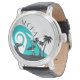 Modernes Wave Design mit Surfer Silhouette auf einem Palmenstrand und "Aloha" Gruß.