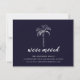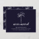 Tropisch bewegende Ankündigung mit einem Set aus Palmen auf schwarzblauem Hintergrund mit einem frischen und modernen Streifen hinten.