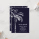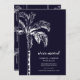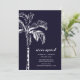 Tropisch bewegende Ankündigung mit einem Set aus Palmen auf schwarzblauem Hintergrund mit einem frischen und modernen Streifen hinten.