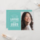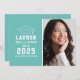Mit dieser Ankündigung und Party Einladung des Abschlusses kündigen Sie Ihren Uni- oder Gymnasialabsolventen im Stil an. Die zweiseitige Karte zeigt ein Senior-Portrait des Absolventen mit Graduiertenkappe und einfaches und modernes weißes Typografie-Design. Aqua oder Robin's eigelblauer Hintergrund kann mit der Funktion "Anpassen" in eine andere Farbe geändert werden, dann Bearbeiten / Hintergrund, um eine andere Farbe auszuwählen.