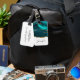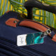 Ein Gepäckanhänger mit abstraktem Stil. Illustration von aquamarinem agate Stein mit verschiedenen Schichten in verschiedenen Farbtönen. Ein Imitat goldenes Glitzer Band läuft zwischen den Farbschichten. Modernes Design.