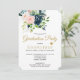 Trendy Blume FOTO Graduation Party stilvolle Einladung Vorlage mit einer schönen Aquarellmarinerie, rosa rot und staubblauen Peony Rose Bouquet mit grünem Blattwerk und Blätter, ein goldener grad Topper und ein elegantes chic Imitate Gold Typografie-Skript. +++++++++++++++ Einfach mit Ihren Daten personalisieren! ++++++++++++++++ Sie können wählen, ob Sie den Schriftart und die Farbe des Buchstaben ändern möchten. +++++++++++++++ Die Einladung eignet sich für den Sommer- oder Herbstausflug rustikaler Land-, Garten- oder Hinterhofplatz-Abschluss.