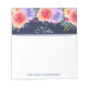 Personalisiertes Notizblock mit einem hübschen Blumenstrauß mit Aquarellfarben-Rose mit Rändern, Blätter und Ästen, die alle in einer farbenfrohen Blumenstruktur an der oberen Grenze vereinen. Navy Hintergrund hinter den Blume. Im Text steht "Muttertag glücklich" mit einem personalisierten Namen. Die obere Grenze hat einen dunkelblauen Hintergrund und die Erholung des Notizblocks ist weiß.