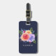 Ein personalisierter Gepäckanhänger mit einem hübschen Bouquet von Aquarellfarben-Rose mit Sprigs, Blätter und Ästen, die alle in einem farbenfrohen Blumengesteck zusammenpassen. Navy Hintergrund.