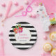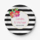 Moderne und schicke, blumengeschmückte Hochzeitspapiertafel mit schwarz-weiß gestreiften Mustern, einem weißen Kreis in der Mitte mit Ihrem Text und hübschen tropischen Blume in Rosa und lila. Es ist eine ideale Wahl für Ihre Hochzeit Brautparty oder Party Tisch.