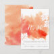 Moderne abstrakte Aquarellpfirsiche Hochzeit RSVP Antwort/Antwort Karte mit einer handgemalten Aquarellfarbe spritzen mit Textur in den Farben Korallenorange und Pfirsich, Ahorn Blätter in Weiß mit Korallenvenen und Text in Weiß und Grau. Dieses elegante und stilvolle lässige Hochzeitsdesign ist ein individuell anpassbares Template für Ihre Hochzeit im Frühjahr, Sommer oder Herbst/Herbst. Beachten Sie, dass dies nur ein Bild von Aquarell ist und keine echte Textur. Für beste Ergebnisse wählen Sie Filz oder andere Papier.