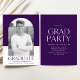Einfache und stilvolle Abschlussfeier mit dem Foto des Absolventen in einem Bogen-Rahmen mit lila-weißem Blockhintergrund. "Graduate" wird in lila moderner Schrift mit dem Namen, der Schule und dem Abschluss des Absolventen angezeigt, wie unten gezeigt. Auf der Rückseite der lila Graduiertenparty finden Sie Details zu Ihrer Graduiertenparty.