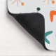 Dieses Mauspad hat ein modernes atomares Design aus Bumerangformen, Antennen und Sternexplosionen in aquamarin, orange.