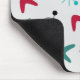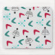 Dieses Mauspad hat ein modernes atomares Design aus Bumerangformen, Antennen und Sternexplosionen in aquamarin, magenta, blau und schwarz.