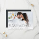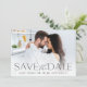 Mit diesem eleganten und modernen Foto können Sie Ihr Hochzeitstag in unvergesslichem Stil verkünden. Die Dattelkarten sparen mit einem voll blutenden, waagerechten oder landschaftsorientierten Foto, das "Save the Date" in schwarzer Schrift am unteren Rand überlagert ist. Ihre Namen, Hochzeitstag und Hochzeitsort erscheinen im modernen Schriftsatz unten. Personalisieren Sie den Rücken mit weiteren Details, wie z.B. Ihre Hochzeitswebsite.