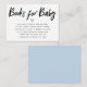 Moderne Buchanforderung Einladung für Ihre Jungen-Babydusche. Im Text oben steht "Babybücher" in einem modernen Script-Schriftart, in dem erklärt wird, wie die Gäste anstelle einer Kinderkarte ein Buch für ihr Kind mitbringen sollen. In der Mitte befindet sich ein blaues Herz, das der Farbe auf der Rückseite der Karte entspricht.